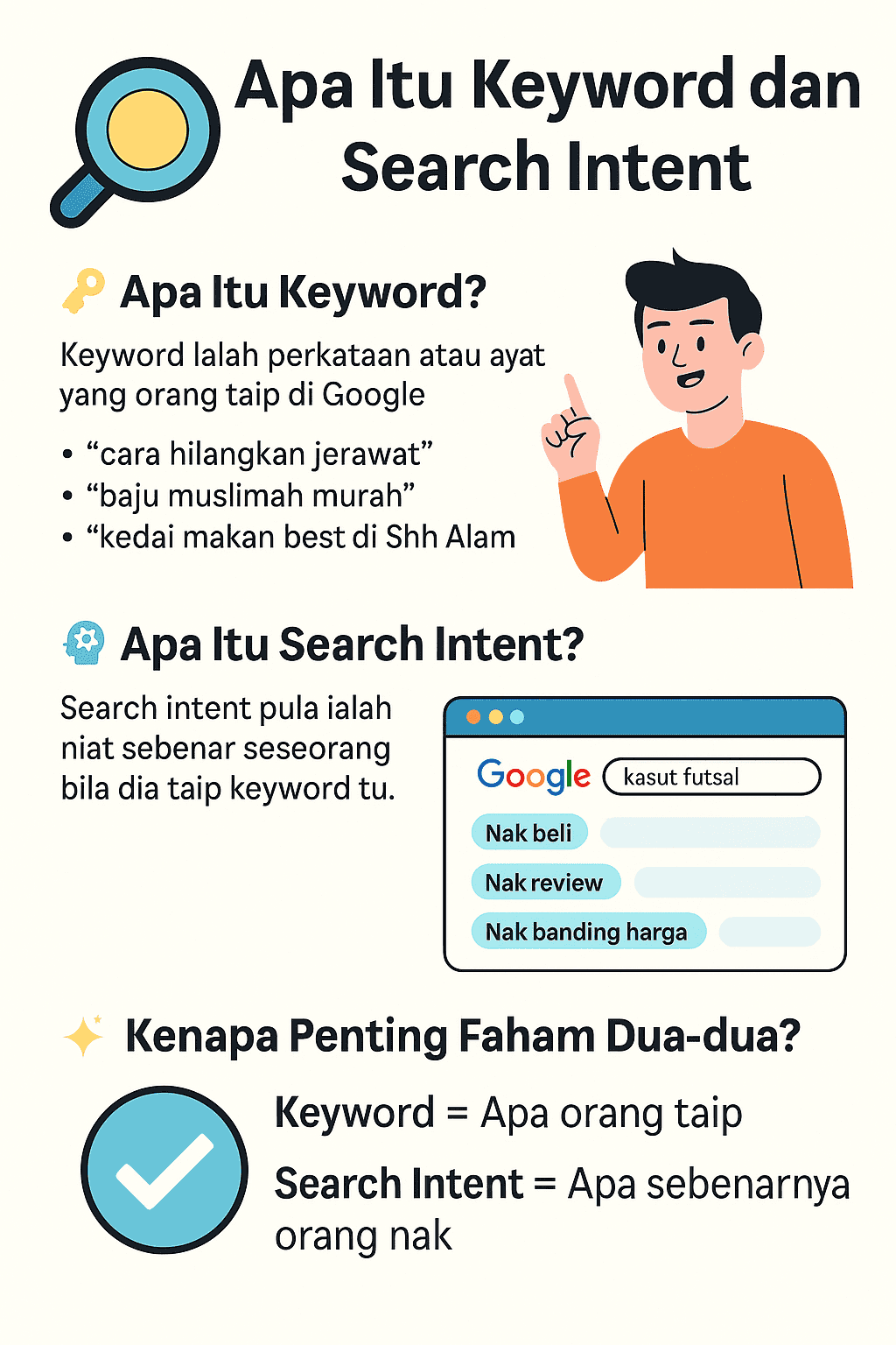 Tapi niat sebenar mungkin: “nak cari kelas atau website yang ajar SEO dari asas”